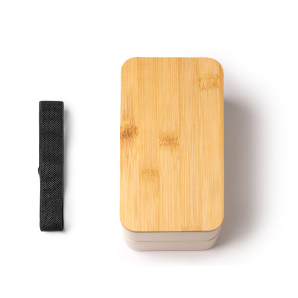 1.4l lunch box in resistant BPA-free veined PP material, with bamboo lid. Two compartments, each with a capacity of 700 ml. Inner compartment with fork, spoon and knife. Including outer safety strap. Food Grade certified, guaranteeing safety when food comes into contact with the material used to manufacture the product.