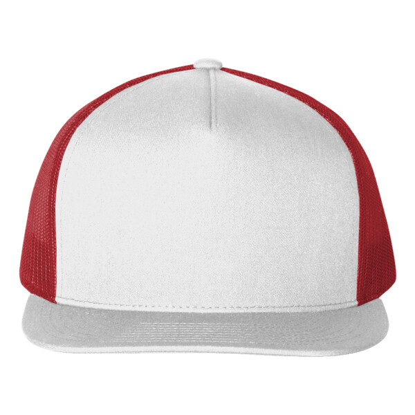 Classic trucker with white front panel. Great for screen printing and embroidery. 5-panel cap with buckram front lining, and classic mesh back-quilted comfort sweatband. 4" high crown, and 8 rows of stitching on flat visor. Matching plastic adjustable str