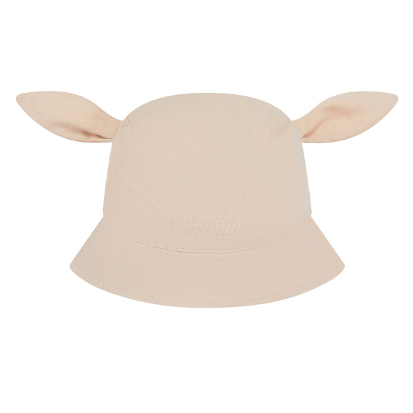 Kids bucket hat with embroidered character facial features. Two colourways in different animal styles. Top-stitched brim detail. Flat top. Elasticated back. Suitable for decoration.