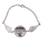 Embrace elegance and symbolism with our beautiful silver angel wing bracelet, featuring delicate wings on either side of a central charm. This thoughtful design symbolizes protection and guidance, making it a meaningful accessory. The charm includes a customizable area, perfect for adding a personal image, making it uniquely yours or a heartfelt gift for someone special. A perfect blend of style and sentiment, this bracelet is a timeless piece to wear close to your heart.